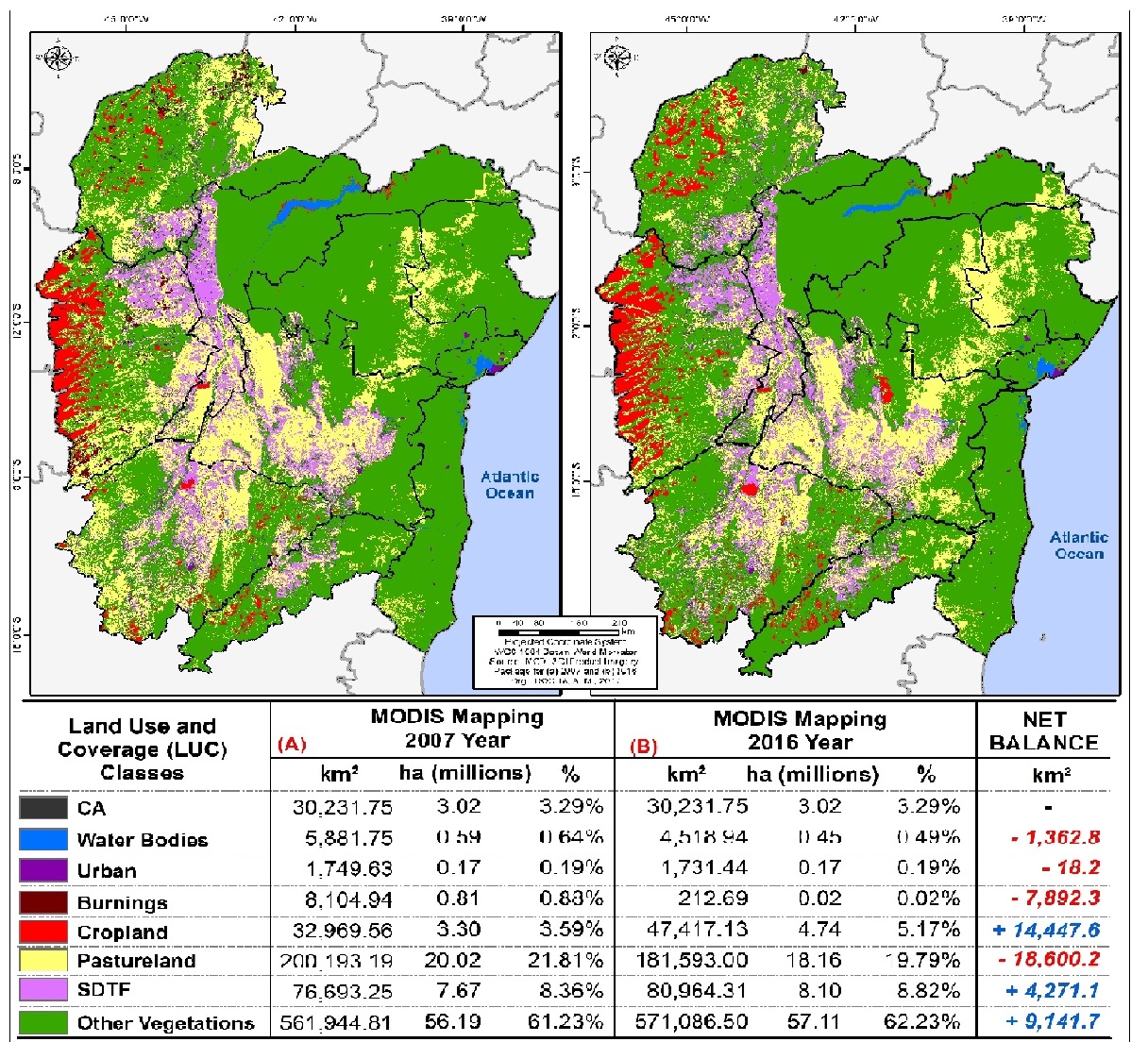 Given our research proposals and the final results achieved, the most important point is that the analyzes of the Brazilian Seasonally Dry Tropical Forest were justified due to the characteristic context of this type of vegetation. In fact, SDTFs are one of the least significant forest formations in the Brazilian territory, as their distribution is in the form of disjunctions that are differentially located inpredominantly non-forested biomes (Caatinga and Cerrado). This circumstance decisively hinders its concrete identification, considering that some of their structural and climatic-edaphic characteristics are similar to other types of formations. Therefore, the mapping of Land Use and Coverage developed forthe years 2007 and 2016 intended to contribute to the effective identification of tropical dry forest areas,and therefore serve as an indirect subsidy for any conservation policies.