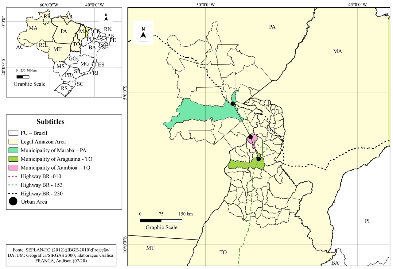 From this perspective, Becker (2013) demonstrates that capital's regulation of the Amazon has structured a small number of key cities to control and exploit the region. Thus, Araguaína, in Tocantins, and Marabá, in Pará, are strategic for agro-mineral exploration, establishing themselves as medium-sized cities due to their size and functionality. Between the two is the city of Xambioá, in Tocantins, a local center with few economic and service attractions (IBGE-REGIC, 2020).
