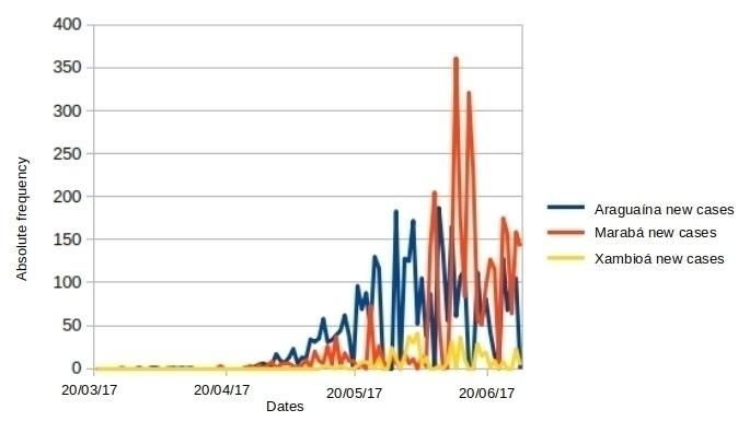 Thus, Table 2 shows similarities between the numbers of new cases for the cities of Araguaína-TO and Marabá-PA. Possibly this is due to the functionality they both exert as Regional Capitals C and references for displacement in search of services, health, and education, as well as the national and international commodities flow.