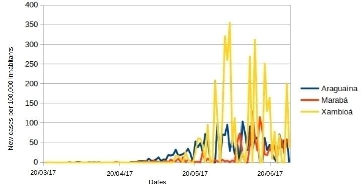 The table presents a closer relationship between Xambioá and Araguaína, as the proportional growth in the number of cases occurred at approximately the same pace in this pair. According to Guedes and Brito (2018), the city of Araguaína acts as an economic and logistical pole for its microregion, including Xambioá, validating our thesis that the cities' influence for capital is high in the relationship between the two municipalities.