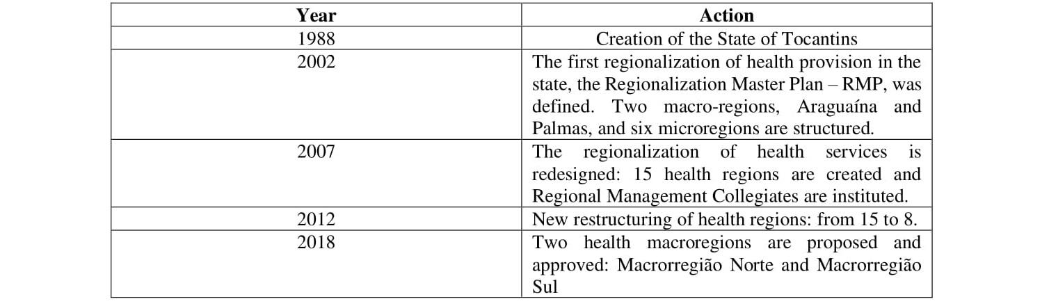 To support our argument, Table 1 below shows the public health management in the State of Tocantins from Law 8080 (BRAZIL, 1990), which institutionalizes regionalization as one of the organizational axes of the Unified Health System.