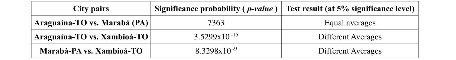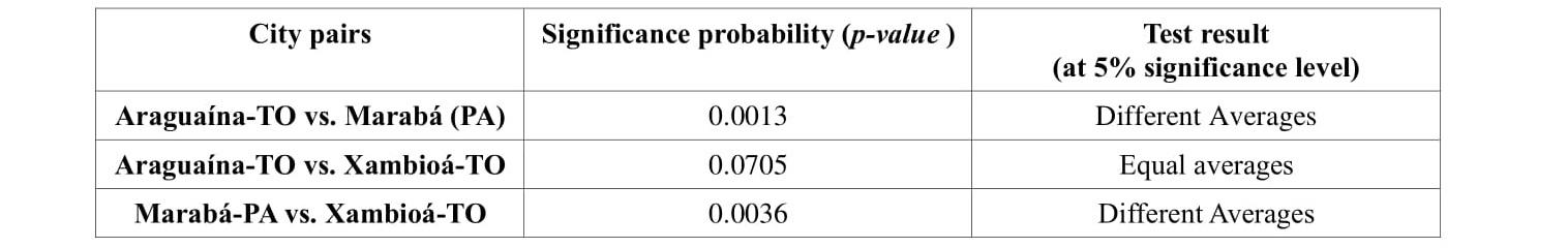 Initially, Table 1 presents a date-paired comparison between the average numbers of new COVID-19 cases. In this case, the comparison is between absolute frequencies involving pairs with the three cities. The significance level of 5%, the standard for statistical studies in social sciences (HAIR et al., 2009), was the parameter employed to assess whether the averages are different or not.