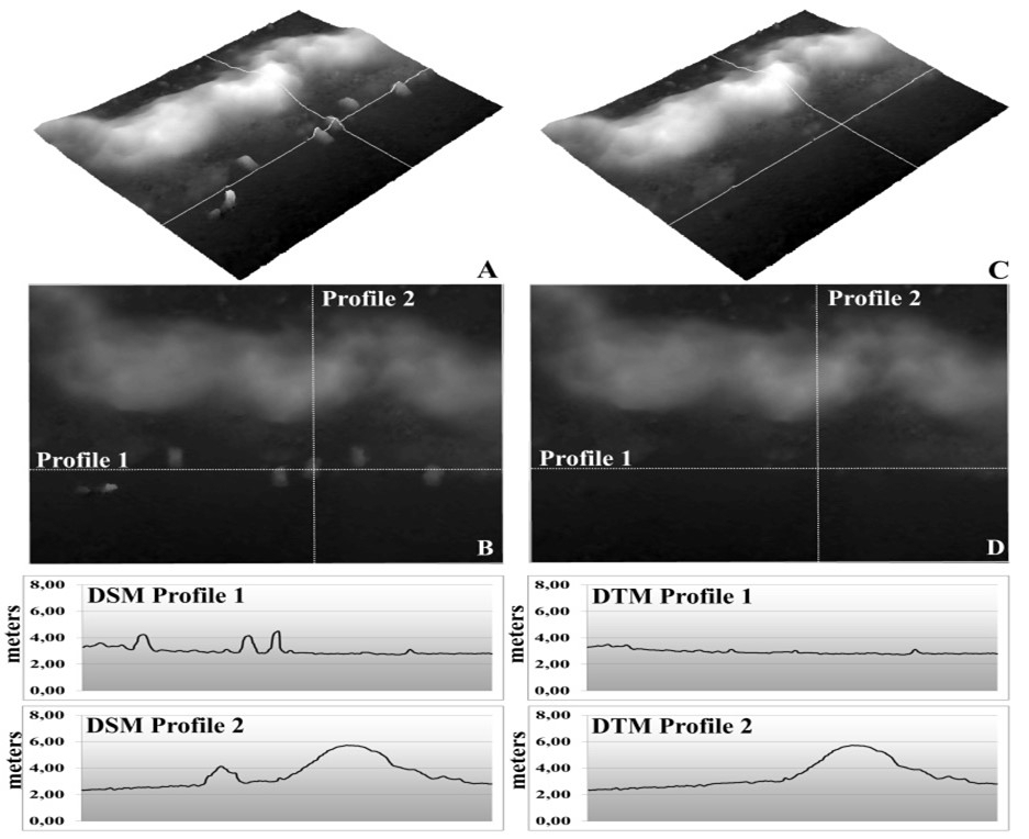 The second aspect identified by Poulter & Halpin (2008) refers to the adequate distinction of the different types of digital elevation models. The DEM usually refers to a digital representation of the earth’s surface, but if it contains data on the height of targets that are above the ground, it is considered to be a Digital Surface Model (DSM), while the Digital Terrain Mod-el (DTM) is a surface model that includes only the ground elevation, with minimal interference from other objects (Figure 8).
