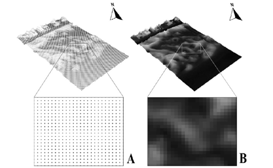 The primary datum for the extraction of geomorphometric parameters is the discrete and continuous representation of the relief in the form of a DEM. The value registered at each point/grid (discrete) or pixel/raster (continuous) is equivalent to the altitude of the terrain and the format of the records will depend on the type of sensor used to collect the data or the data conversion processes (Figure 1). Eakins & Grothe (2014) alerted that the conversion of discrete records to continuous surfaces using interpolators is an extremely delicate step in the geomor-phometric reconstruction process, given that it can cause severe distortions in the topographic information through the smoothing of the features. As a practical rule, the denser the cloud cov-er of the data points, the smaller the weight of the estimation method (EAKINS & GROTHE, 2014). It is important to note here that the conversion of records can also produce artifacts or edge effects that must be identified and corrected before other parameters can be extracted from the DEM (DANIEL, 2010; EAKINS & GROTHE, 2014; DANIELSON et al., 2016).