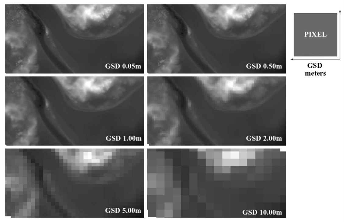 Jensen (2014) established one general, but practical rule to determine the resolution re-quired for an analysis, i.e., that the GSD image should be at least half the size of the target to be identified, in its smallest dimension. However, Hengl & Evans (2009) encouraged the use of mathematical applications for the more adequate determination of the cell-pixel size of the DEM, taking the density of inflections of the terrain into account for the digital representation, that is, the more heterogeneous the morphology of the landscape to be reconstructed, the greater the sampling effort should be.