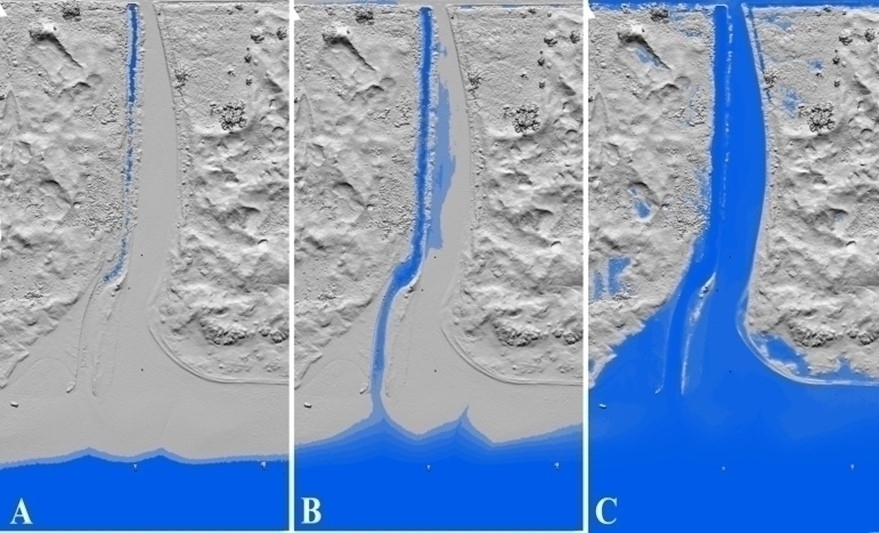 One of the limitations of the bathtub approach is that it is not adequate for the modeling of shallow waves, as provided by other modeling systems (the Simulating WAves Nearshore [SWAN] model, for example), even when topo-bathymetric data are integrated. Similarly, mor-phodynamic processes and sedimentary flows cannot be predicted by surface analysis. Alt-hough the approach now includes the roughness of the terrain and water displacement direc-tions, based on the analysis of optimal flow paths, the method still uses waves height and sea-level projections as predetermined, fixed input.