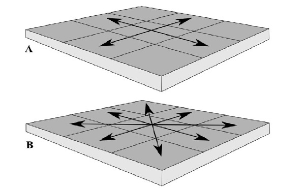 The zero-way rule, which was presented above, is applied in the simple bathtub ap-proach, in which there is no hydrological connectivity among the cells (no displacement). This single condition rule states that the cell will be flooded instantaneously if its elevation is lower than the projected sea level (YUNUS et al., 2016). By contrast, the four-way and eight-way rules establish paths connecting adjacent cells (Figure 7). The four-way rule is based on the con-nection of the cells located in the four cardinal positions, evaluating paths in four possible direc-tions. The eight-way rule, adds the four diagonal axes, permitting the evaluation of eight possi-ble path directions.