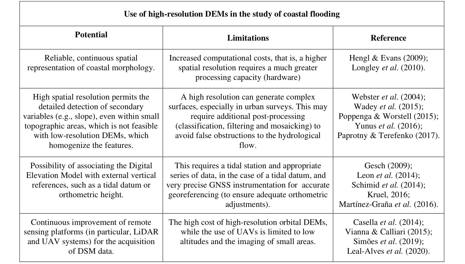 In the specific case of coastal flood models, Yunus et al. (2016) and Paprotny & Terefenko (2017) concluded that the geomorphometric generalization of the features will result in severe limitations of the assessment, producing major errors of estimation, which depreciate the approaches that are highly dependent on the topographic component. Given this, DEMs with either a very coarse resolution or with severe information losses due to a strong smoothing in the register conversion stage (Eakins and Grothe, 2014) are not adequate to assess sea-level rise, given that small differences in elevation may have different impacts on the affected areas (GFDRR, 2015).