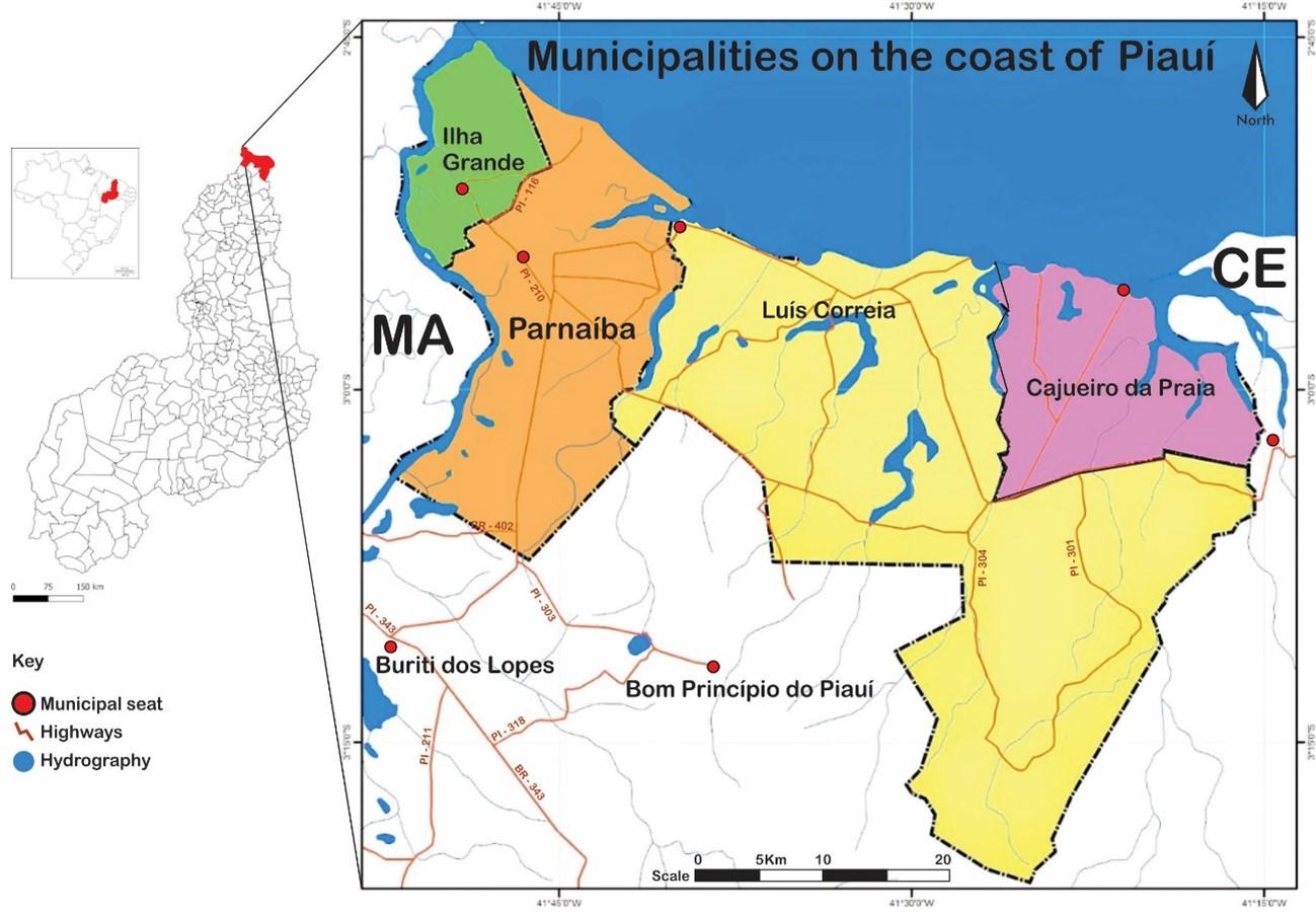 This study aims to understand the territorial dynamics and impacts caused by tourist activity on the coast of Piauí, characterizing the activity, concentration, and dispersion of spatial structures associated with it in the four municipalities that compose the Piauí coast: Ilha Grande, Parnaíba, Luís Correia, and Cajueiro da Praia located in the northern portion of the state, between Maranhão and Ceará (MAP 1 ).
