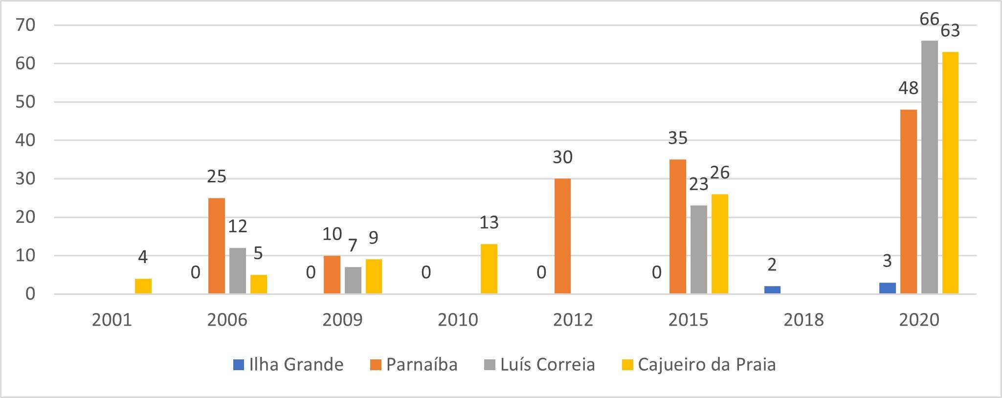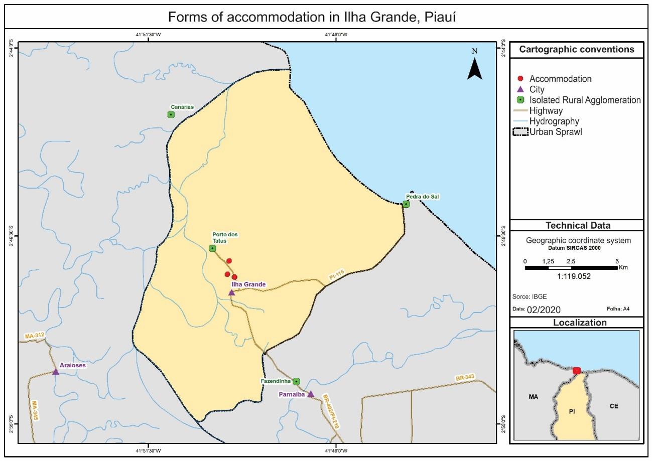 Ilha Grande's situation concerning tourism is reflected in its infrastructure; in a survey carried out in 2015, the municipality did not have any forms of visitor accommodation (SILVEIRA, 2016). In 2018, there were two establishments (ROCHA, 2018), changing little in 2020, when the number grew to three (MAP 2). The increase is below that observed in neighboring municipalities but followed the growth trend perceived across the coast of Piauí, especially when comparing surveys carried out between 2015 and 2020.