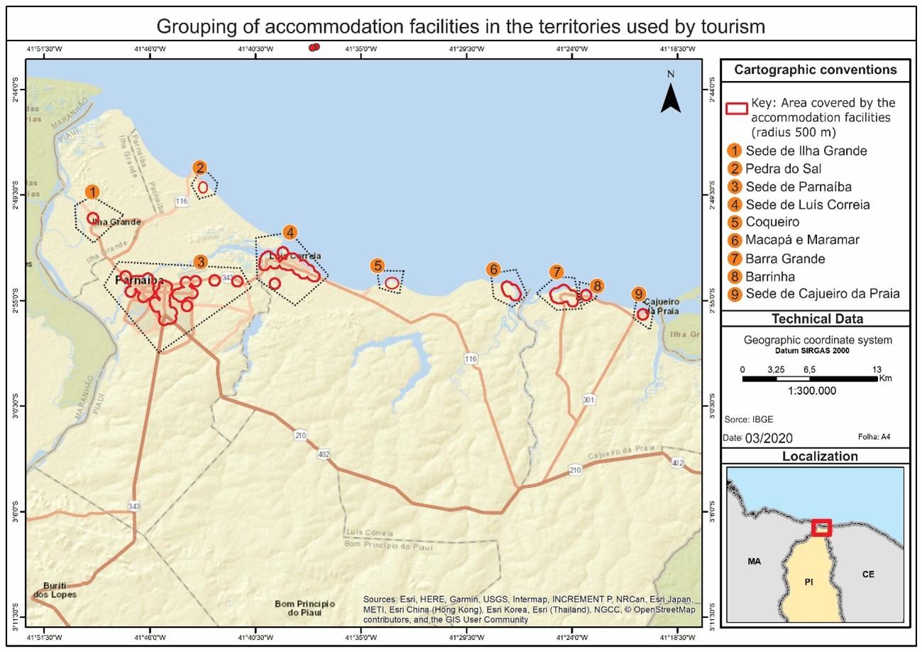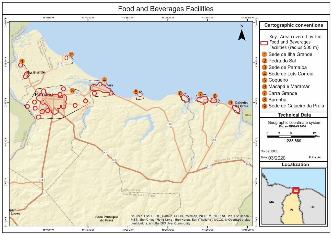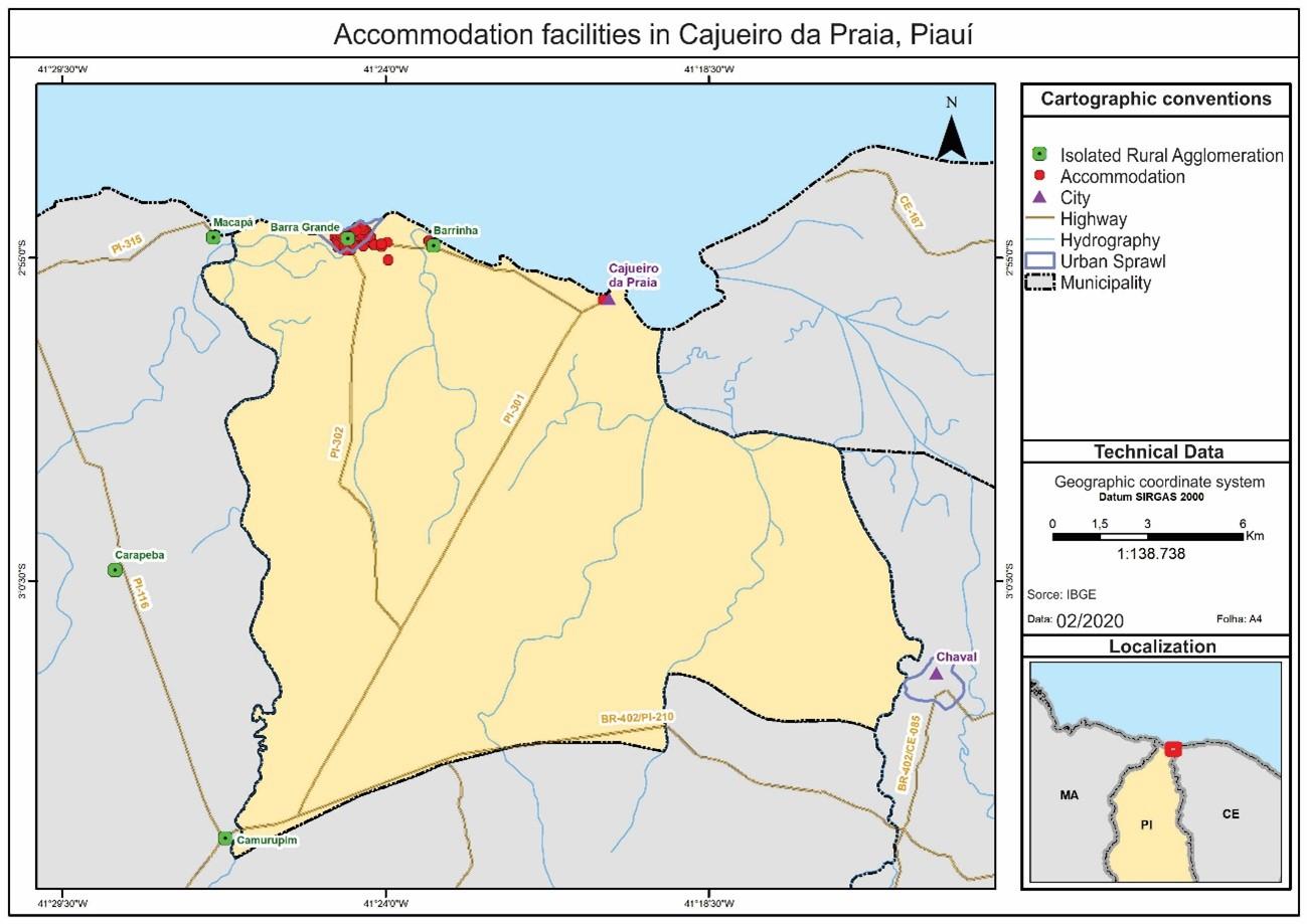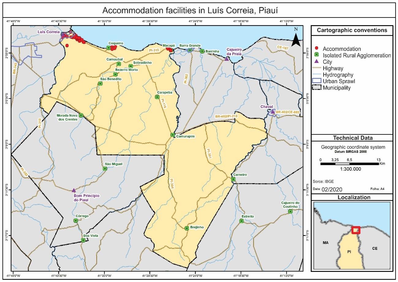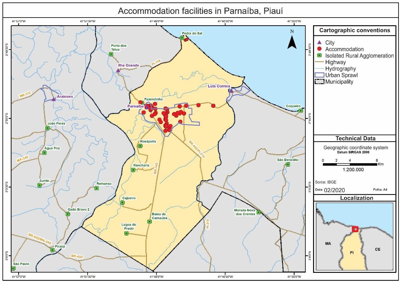 The primary data were georeferenced and represented on three different scales to understand the dispersion and / or grouping of the tourist infrastructure. The primary information from fieldwork has been complemented and reviewed by secondary sources via Google Maps and Google Earth. The geographic coordinates and information about the infrastructures were organized in Excel spreadsheets and later converted to the shapefile format. The ArcGis 10.1 Geographic Information System software was used to create the maps. The cartographic bases use the UTM projection and the Geocentric Reference System for the Americas (SIRGAS 2000 UTM Zone 23s). In addition, the following sources were used: the base shapefile of each municipality's network was taken from the website of the Brazilian Institute of Geography and Statistics (IBGE) and the North American Environmental Systems Research Institute (ESRI); the shapefile of the Piauí's highways came from the website of the National Department of Transport Infrastructure (DNIT); Google Maps (2020) and the Chico Mendes Institute for Biodiversity Conservation (ICMBio, 2020).