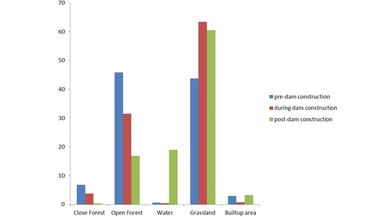 Kruskal Wallis test indicated significant difference among the various landcover classes (H = 9.33, ρ < 0.05) and Tukey’s post hoc analysis revealed a significant difference between five out of the 10 pairs of the land cover classes. Before the dam construction, open forest occupied the largest portion of the total land area with 45.87 % (Figure 4). However, this changed during the post-dam construction, with grassland (60.54 %) occupying the largest percentage cover, followed by water body with 19.01 %.