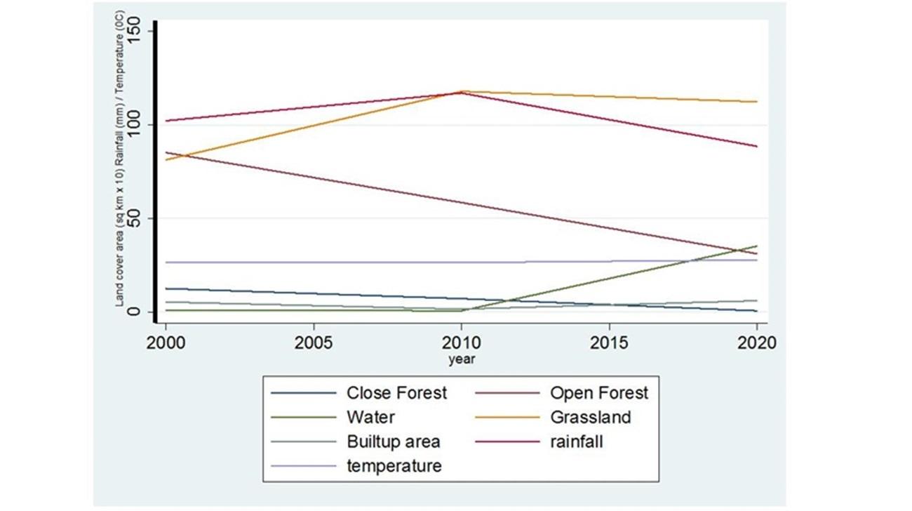 Land cover changes and climatic variables seem to follow a similar trend over the period after the dam construction (Figure 5). For example, a decrease in the amount of rainfall corresponded with a decrease in close forest and open forest. During the same period, water body, grassland and builtup area increased with marginal increase in temperature. Increase in water body results from the reservoir created by the dam and grassland and builtup area is caused by forest degradation corresponding with temperature increase.