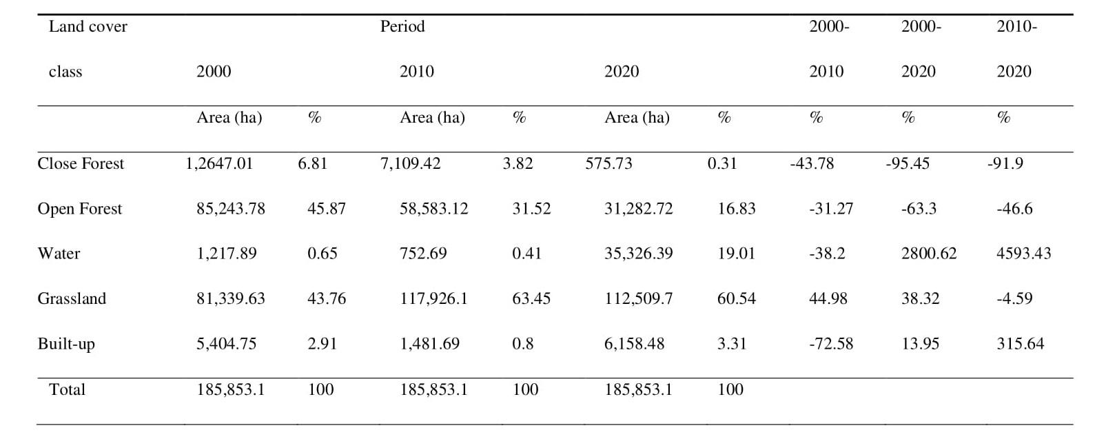 In all, five land cover types were identified, namely; built-up, close forest, grassland, open forest, and water body. A set of three different land cover maps covering the study area for the years 2000, 2010 and 2020 is shown in Figure 3.