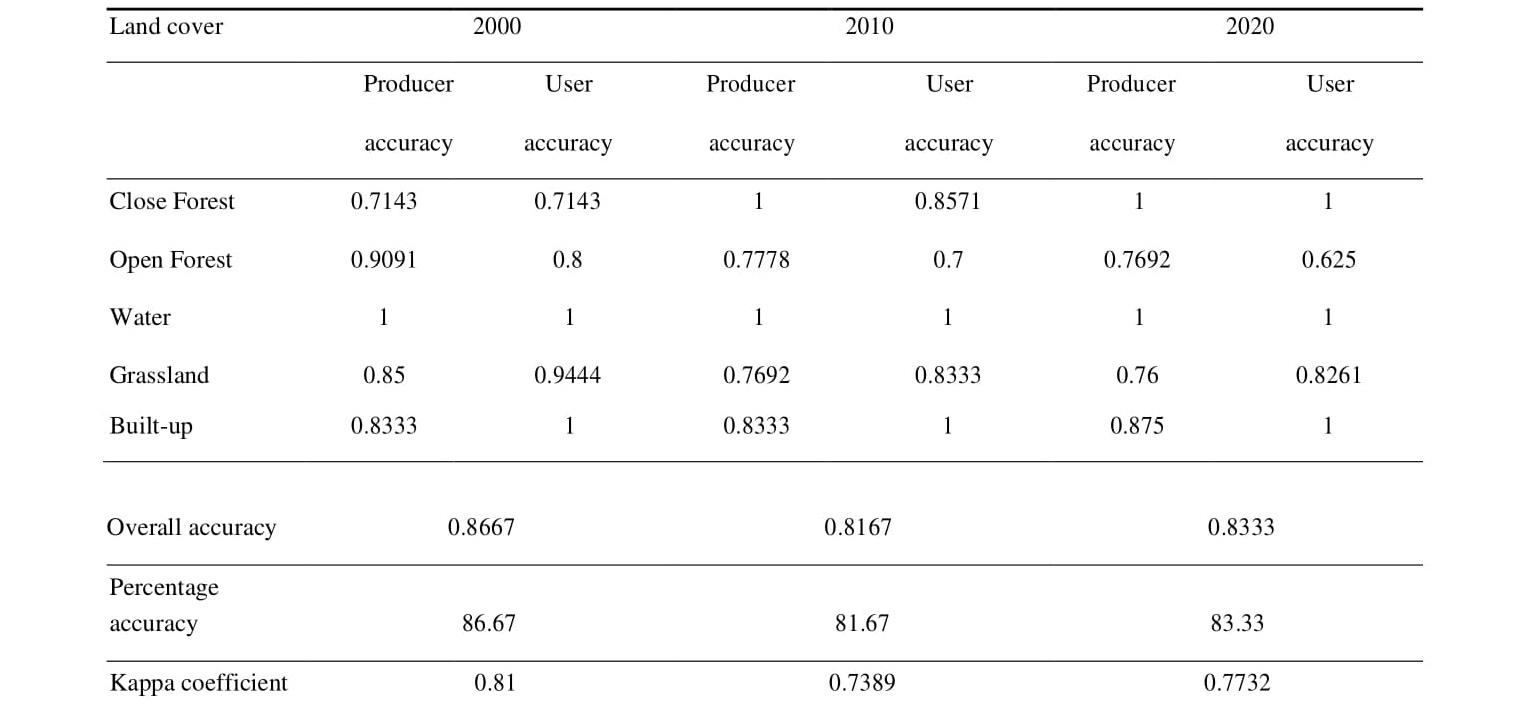 The overall accuracy for 2000, 2010 and 2020 were 86.67 %, 81.67 % and 83.33 % respectively (Table 2). The highest validation data for 2000, while that of 2010 were of least quality was recorded. The figures indicate that the land cover classification for the periods 2000, 2010 and 2020 were correctly classified. The calculated Kappa coefficients were 81 %, 73.89 %, and 77.32 %, respectively, for 2000, 2010 and 2020 (Table 2), representing strong agreement.