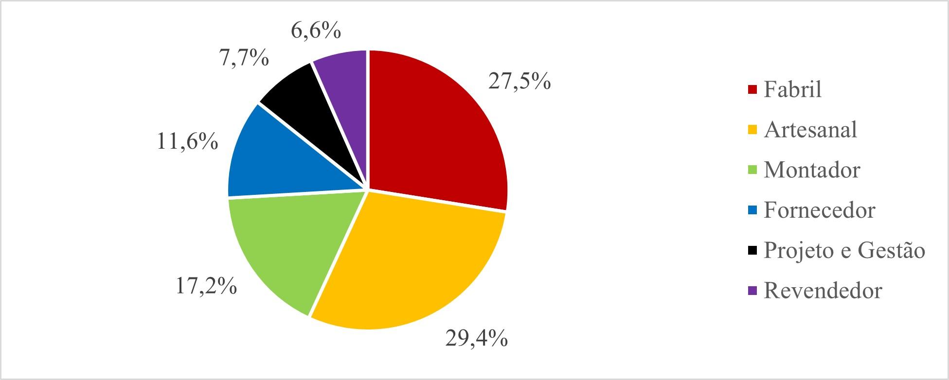 All the individuals sampled were categorized according to their operational activity related to the production and/or trade of timber houses (Table 2). According to Figure 1, about 57% of the sector are full producers (handcrafted in construction sites and factories in industrial plants) with productive and commercial operations. Of the remainder, 19% are partial companies working in production and services (suppliers of prefabricated kits and project and construction management offices), and 24% are construction services companies (retailers and assemblers of prefabricated kits).
