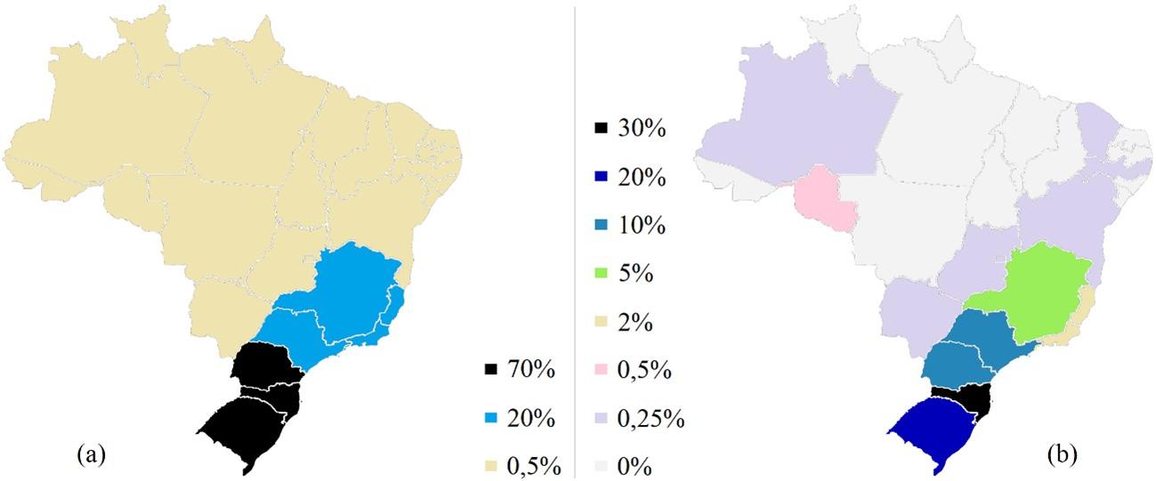 Once the headquarters of the 378 companies that formed the valid results had been compiled into a detailed list, the mapping began to identify business concentrations located in Brazil. The complete ranking of business volume (by municipality, state, and macro-region) can be found in Appendix 1. Therefore, in summary, the sectoral composition consists of 378 individuals spread over 151 municipalities located in 15 federative states of the five national macro-regions. The uneven distribution of this sector was noted, both by macro-region (Figure 2a) and by state (Figure 2b). From the point of view of its macro-regional distribution, the sector was concentrated in the South and Southeast.