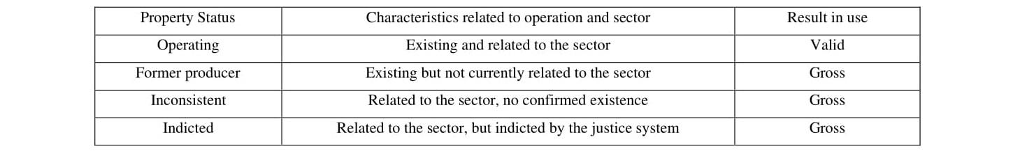 As these searches showed companies that had closed and former producers (with other activities or impeded by judicial indictments), a triangulation process was used to certify the veracity of the data obtained. Thus, the companies were categorized to guide the analysis and obtain valid results by labeling each individual based on their operating status (Table 1).