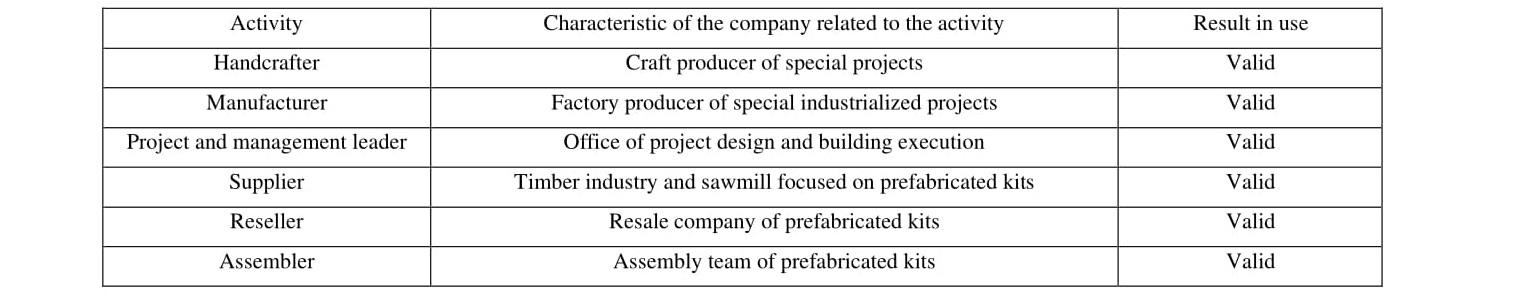 After 40 days of searching for companies in the timber house sector in Brazil, the results giving new answers petered out, suggesting the end of this preliminary stage. Then, the second stage categorized each company according to its current operating condition, and the final listing was completed (Table 4).