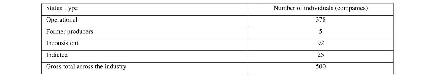 Surprisingly, it was confirmed that some companies had legal restrictions on their operations attributed to some possible criminal indictment by the Brazilian justice system. Based on the argument applied to the previous group (ex-producers), disregarding indicted companies was justified by the inactivity of their operations.