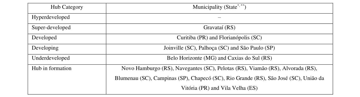No business hub was found in the North, Northeast, and Center-west macro-regions; neither were any locations categorized as a "hyperdeveloped hub." However, Gravataí municipality in Rio Grande do Sul may be the first to reach this mark (Table 6), when it has 50 active companies in this sector study (Table 3).