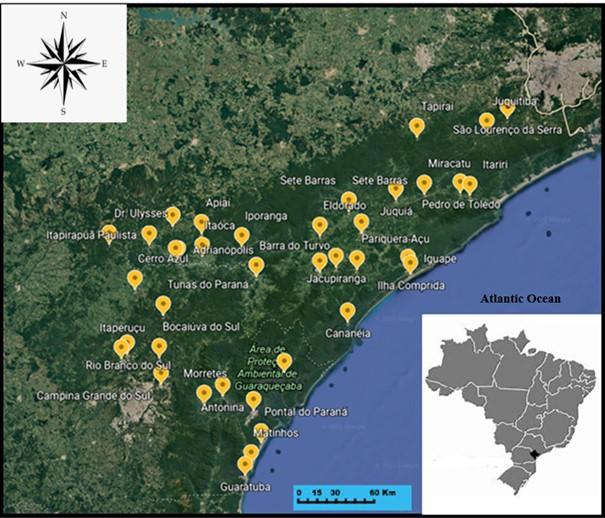 The Differentiated Mesoregion of Ribeira Valley/Guaraqueçaba is located in the State of Paraná and covers the following municipalities (Figure 1): Adrianópolis, Antonina, Bocaiúva do Sul, Campina Grande do Sul, Cerro Azul, Guaraqueçaba, Guaratuba, Itaperuçu, Matinhos, Morretes, Paranaguá, Pontal do Paraná, Rio Branco do Sul, Tunas do Paraná, and Doutor Ulysses. In the State of São Paulo, it comprises the municipalities of Apiaí, Barra do Chapéu, Barra do Turvo, Cajati, Cananéia, Eldorado, Iguape, Ilha Comprida, Iporanga, Itaoca, Itapirapuã Paulista, Itariri, Jacupiranga, Juquiá, Juquitiba, Miracatu, Pariquera-Açu, Pedro de Toledo, Registro, Ribeira, São Lourenço da Serra, Sete Barras, and Tapiraí (BRASIL, 2020).