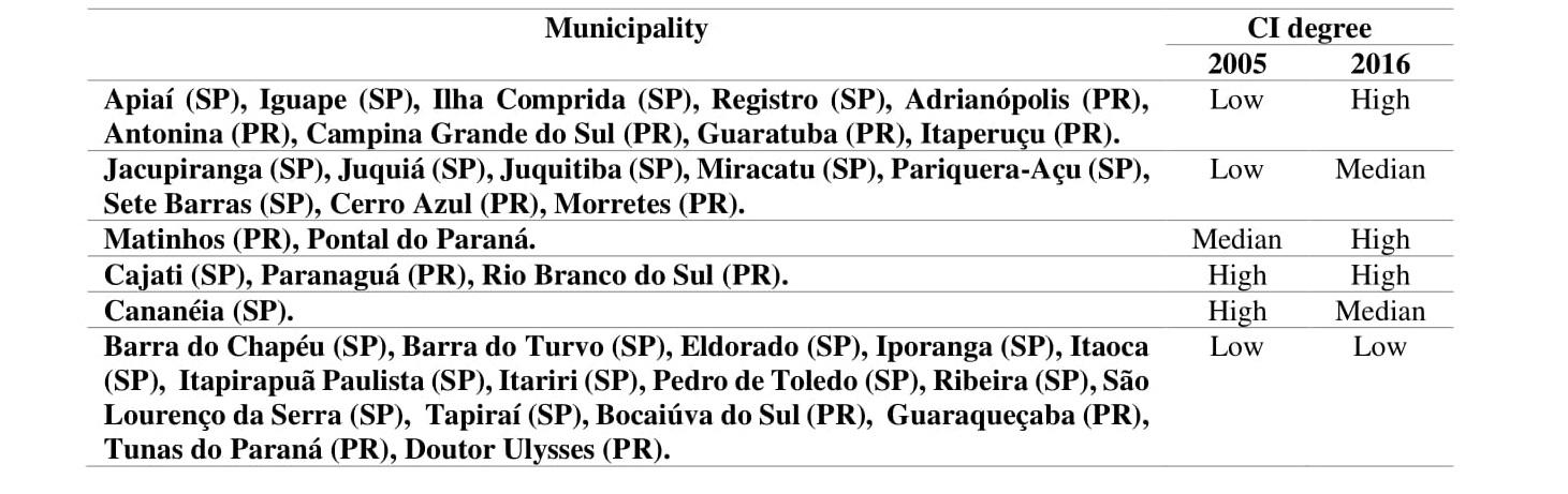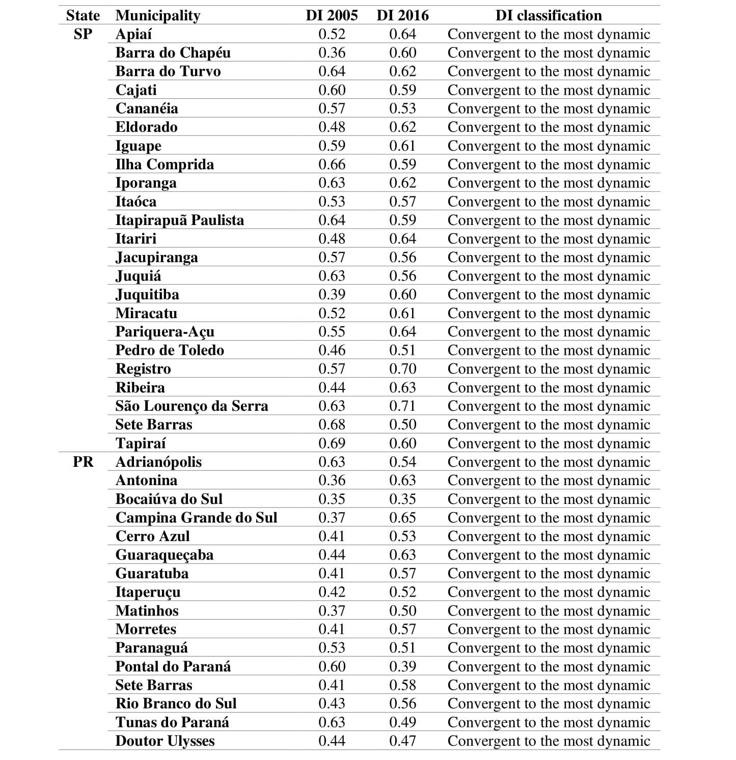 The matter on municipal socio-economic development showed a convergence of municipalities to the most dynamic, which infers a positive convergence in terms of improvements in living conditions. However, the variables employment and income were the most fragile, that is, the polarization of Paranaguá (PR) and the strong concentration of extractive and transformation activities in Cajati (SP) demonstrate that initiatives focused on diversification and value addition in productive activities should be the focus of public policy actions in next years. Because a significant portion of the regional territory has strong tourist potential in the coastal and mountain areas, it is also necessary to reconcile the potential of tourism with activities that enhance and create a market for regional products.