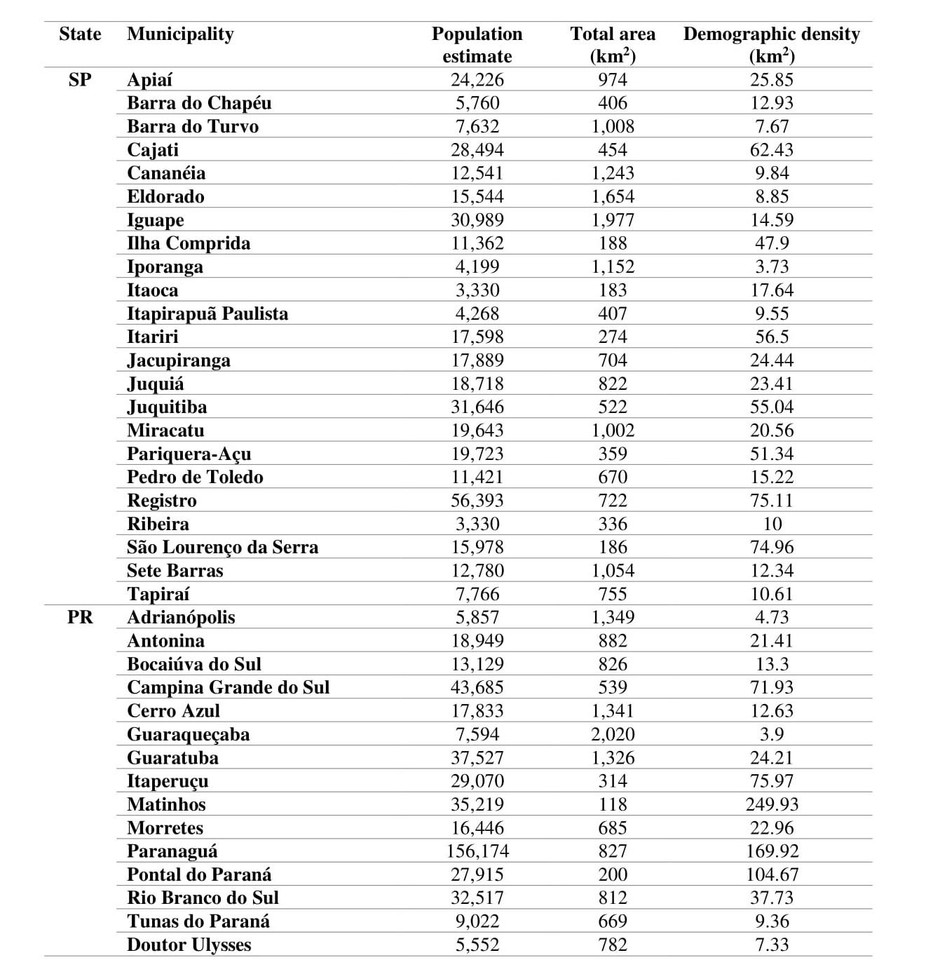 In general, the Differentiated Mesoregion of Ribeira Valley/Guaraqueçaba is marked by a low population contingent when correlated to its total area and demographic density of the territorial unit (Table 1). Furthermore, its territory is located between the Ribeira de Iguape River Basin and the Iguape-Cananéia-Paranaguá Estuarine Lagoon Complex, comprising the southeastern regions of the State of São Paulo and the eastern regions of the State of Paraná, that is, 1,119,133 and 1,711 .533 hectares, respectively, covering a total area of approximately 2,830,666 hectares (BIANCHINI, 2010).
