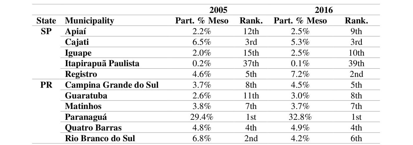 Regarding the participation of the primary GDP of each municipality relative to the primary GDP of the Differentiated Mesoregion of Ribeira Valley/Guaraqueçaba, Barra do Chapéu (SP), Barra do Turvo (SP), Cananéia (SP), Iguape (SP), Ilha Comprida (SP), Iporanga (SP), Jacupiranga (SP), Pariquera-Açu (SP), Ribeira (SP), São Lourenço da Serra (SP), Sete Barras (SP), Adrianópolis (PR), Campina Grande do Sul (PR), Guaraqueçaba (PR), Guaratuba (PR), Itaperuçu, Matinhos (PR), Morretes (PR), Paranaguá (PR), and Pontal do Paraná (PR) were the municipalities that improved their position in the ranking.
