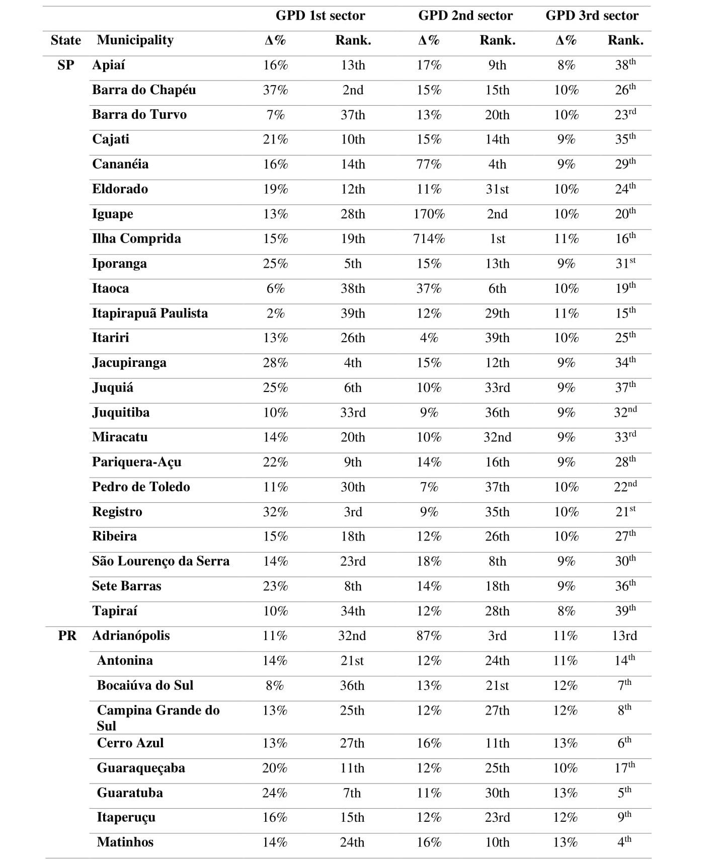 THERE are some important considerations in the economic dynamics of municipalities belonging to the Differentiated Mesoregion of Ribeira Valley/Guaraqueçaba regarding the municipal percentage participation and ranking based on GDP data for the period from 2005 to 2016. Table 2 summarizes the participation and ranking of the total GDP of the municipalities for 2005 and 2016.
