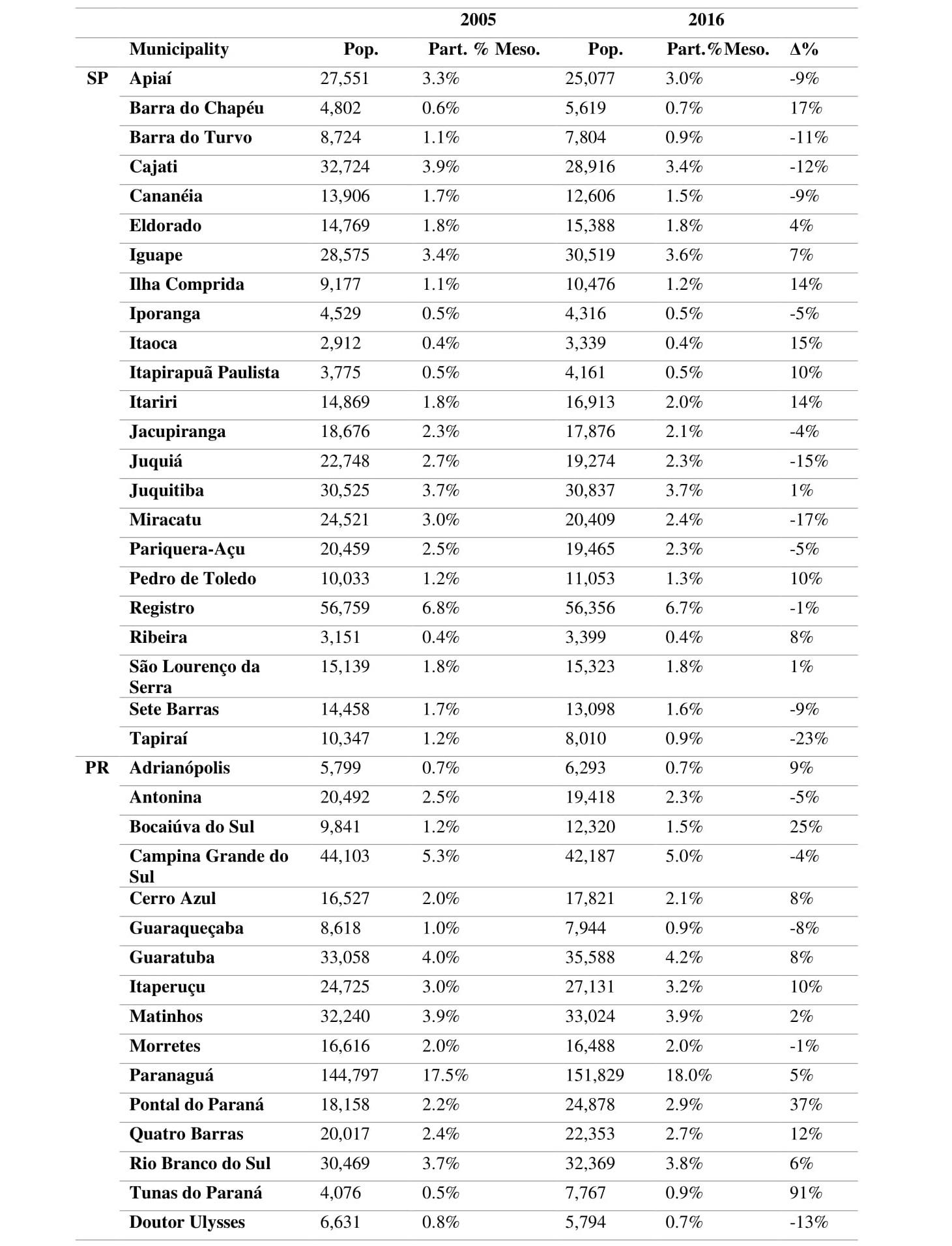 Considering the role of the State as a formulator of public policies, this section sought to present and discuss the results of the Centrality and Regional Disparity indicators from the economic, population, and municipal socio-economic development dynamics in the Differentiated Mesoregion of Ribeira Valley/Guaraqueçaba.