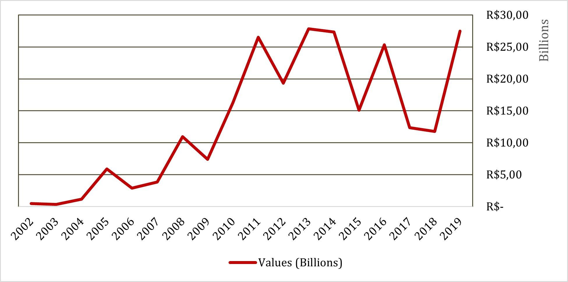 Figure 1 can be interpreted as the trajectory of the real estate receivables market's development, commercialization, and the capitalization of its resources. Two moments stand out: the first, between 2002 and 2010, confirms Botelho (2007) and Fix's (2011) analyses, which point to the restricted character of the real estate receivables market, marked by weak dynamism and low values issued in R$ (reais). Subsequently, between 2011 and 2019, the values in R$ (reais) increased each year, indicating the market's growth, peaking in 2013; there was an expansion of approximately 5.620% between the beginning and end of the series. However, it is worth stressing that this increase was not free of instabilities and significant oscillations.