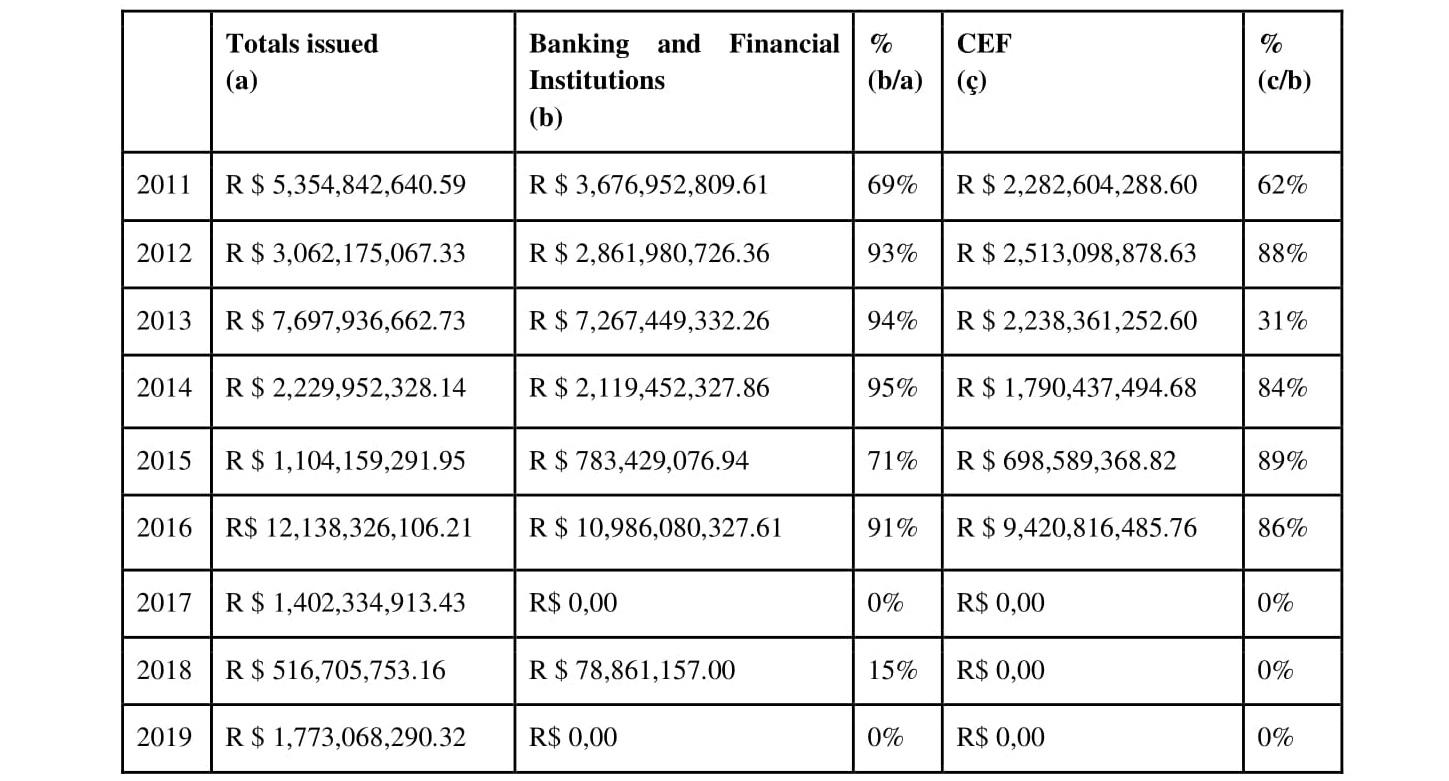 b. The CEF stands out among banking and financial institutions as it concentrates the largest volumes, except for 2017, 2018, 2019, when the CEF did not issue and 2013, when the CEF only had 31% of the total issued by all other institutions. In the other years, it was responsible for more than 60% of the volumes.