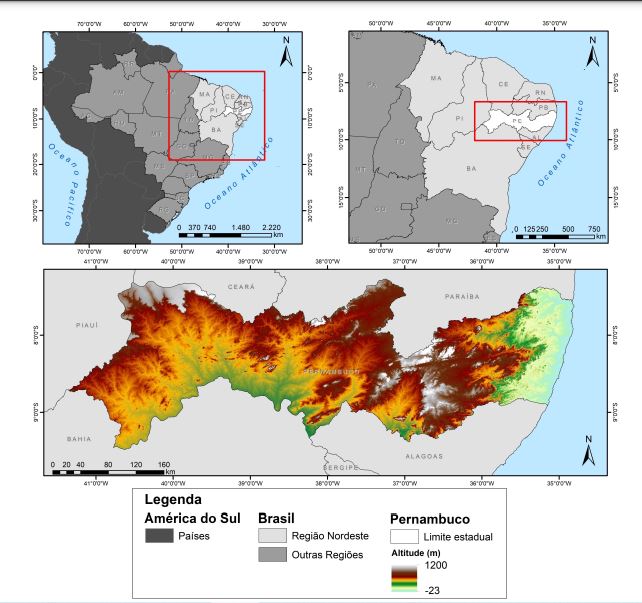 Fonte: Autores. Banco de dados: NASA Earth Data.Estudos mostram uma correlação positiva com a diferenciação climática em relação à geomorfologia de Pernambuco, principalmente na interface entre precipitação e altitude no estadoALBUQUERQUE et al., 2019). Molion e Bernardo (2002) e Ferreira e Melo (2005) microescala. Dois mecanismos de macroescala se destacam: os sistemas frontais e a Zona de Convergência Intertropical (ZCIT). Na mesoescala, você é particularmente responsável por chuvas torrenciais deflagrando movimentos de massa, complexos convectivos e brisas marítimas e terrestres. Na microescala, círculos orográficos e pequenas células convectivas (MOLION e BERNARDO, 2002; FERREIRA e MELLO, 2005).