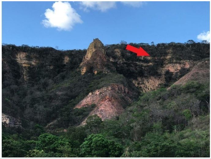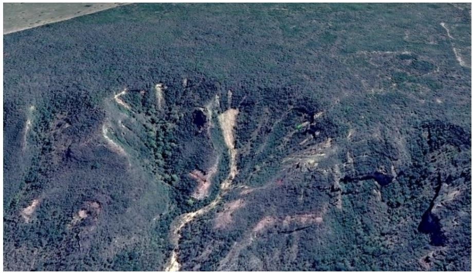 Exemplo de imagem de satélite utilizada para localizar uma cicatriz de deslizamento na escarpa sul da Chapada do Araripe (município de Exú, semiárido de PE).