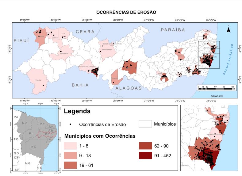 No Nordeste do Brasil, em termos gerais, os estados de Pernambuco e Bahia se destacam quando eclodem movimentos de massa. Juntos, ambos concentram 89,5% desses processos desde 1991 (CEPED/UFSC, 2013; SANTOS et al., 2018). Nesse contexto, Pernambuco apresenta uma variedade longitudinal de usos e ocupações do solo muito influenciada por questões geomorfológicas e climáticas. O estado apresenta uma diversidade de paisagens e contrastes ambientais cujos processos morfodinâmicos, principalmente erosão e deslizamentos, atuam amplamente em todo o território, tanto em áreas úmidas quanto semiáridas. Apenas na Região Metropolitana do Recife (RMR), por exemplo, os municípios de Recife, Jaboatão dos Guararapes,