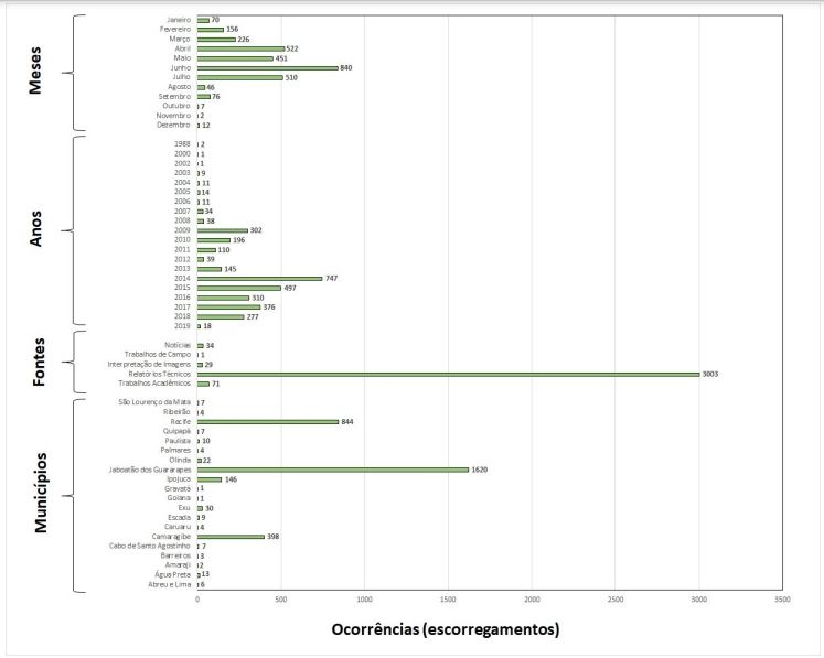 Com relação às fontes utilizadas, 3.003 deslizamentos (95%) foram adquiridos por relatórios técnicos (por exemplo, bancos de dados fornecidos pelas Defesas Civis Municipais de Camaragibe, Jaboatão dos Guararapes e Recife e pelo CEMADEN), além da CPRM (BITAR, 2014) e SINPDEC (2019) (Figura 6). Setenta e uma ocorrências foram captadas do trabalho acadêmico de Torres (2014), que mapeou deslizamentos no município de Ipojuca, litoral sul do estado (RMR) (Figura 6).