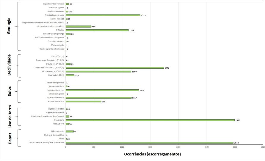 Aproximadamente 95% dos deslizamentos estão localizados em áreas urbanas (2.995 ocorrências) (Figura 7), reforçando a maior incidência de processos condicionados por parâmetros antrópicos em Pernambuco. Consequentemente, causam danos a pessoas, casas e vias públicas (2972 danos) e mortes (22 catalogadas) (Figura 7).