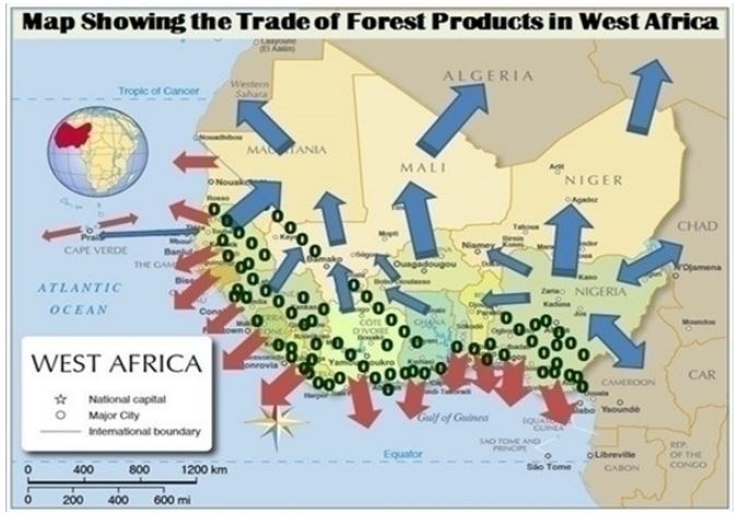 A sub-região da África Ocidental também goza do comércio de exportação e importação de produtos florestais e não florestas. O mapa (Figura 3 acima) revela o comércio de produtos florestais na África Ocidental e em outros países, como mostram os produtos florestais diretos nas fronteiras dos países selecionados para outros países (como cogumelos mostrando o comércio inter-regional principalmente nas sub-regiões da África do Norte e Central de baixo para cima, Na medida em que os cogumelos verdes mostram o comércio intercontinental através do Oceano Atlântico-Golfo da Guiné e os pontos verdes mostram o domínio dos produtos florestais na sub-região de WA). Nos dados publicados pela FAO, as nações sahelianas de Burkina Faso, Mali, Mauritânia e Níger são classificadas como Norte da África e não África Ocidental no Global Forest Resources Gap (FAO, 2006; FAO, 2010). A África Ocidental é composta por 16 países que vão principalmente da zona de savana do Sahel Ocidental à zona guineense-congolesa no não-sudeste, dividida por um gradiente climático. As florestas tropicais da sub-região de WA, florestas secas e savânicas suportam uma enorme e ampla variedade de flora natural e rica biodiversidade florestal.