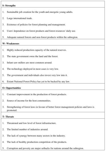 A Tabela 1 explica a Avaliação SWOT (Forças, Fraquezas, Oportunidades e Ameaças) da Sub-região no que se refere à Floresta e ao Comércio de Produtos Florestais na África.