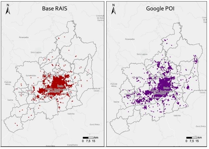 Em comparação com a base de dados RAIS, uma das desvantagens mais marcantes do POI do Google é que todas entidades geralmente são consideradas igualmente, enquanto a primeira leva em consideração o tamanho e o peso de cada serviço por meio de informações como número de funcionários, número de alunos e pacientes (para instalações educacionais e de saúde) e o volume de vendas. Assim, investigações que utilizam a base de dados da RAIS podem atribuir maior peso a instalações maiores, como escolas e hospitais. No entanto, argumentamos que os dados do POI ainda podem oferecer informações valiosas sobre a distribuição espacial dos serviços ao medir as centralidades urbanas.