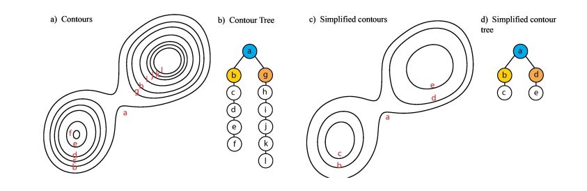 unidade constituinte e pode ser caracterizada por um valor máximo local e um grupo de linhas de contorno fechadas que o contenham. Depois de converter uma única estrutura concêntrica em uma árvore de contorno aninhada, a região contida em cada contorno