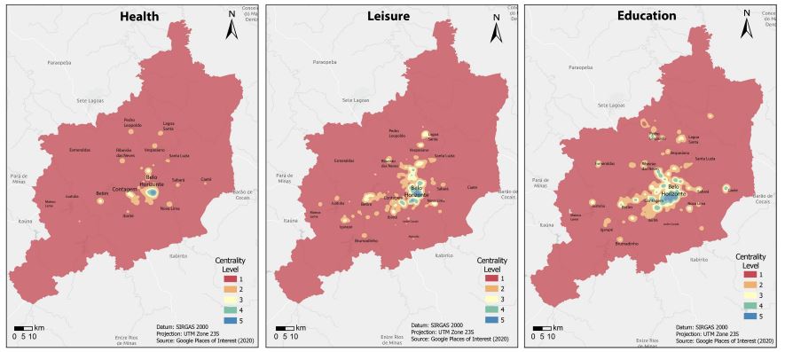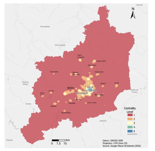 A categorização dos dados do POI por tipo é utilizada para identificar centralidades funcionais na RMBH. A distribuição de equipamentos em uma cidade segue diferentes padrões com base no tipo de atividade e é determinada por uma pluralidade de atores urbanos, privados e públicos. Certas categorias de instalações seguem padrões de aglomeração, enquanto outras são amplamente distribuídas no território. Essas áreas variadas podem levar a desigualdades significativas na acessibilidade dos equipamentos urbanos, particularmente nas áreas suburbanas. As estratégias utilizadas utilizadas para acessar um serviço local, como uma padaria ou um correio, não são as mesmas para acessar uma instalação de grande escala, como um hospital. Assim, defende-se a identificação de centros e subcentros usando as cinco categorias principais propostas na seção três.