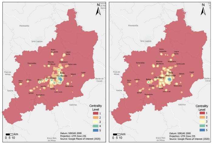 Abstract: Esta pesquisa oferece uma nova exploração da distribuição dos equipamentos urbanos na Região Metropolitana de Belo Horizonte, para identificar centralidades primárias e secundárias. As principais descobertas são baseadas em uma Densidade de Kernel, usando dados do Google Places of Interest. Centros metropolitanos primários e secundários são detectados nos maiores municípios da Região Metropolitana, bem como subcentros suburbanos menores em municípios periféricos. Além disso, a análise de cinco categorias de estabelecimentos ilustra diferentes centralidades, estruturas e desigualdades na distribuição dos diferentes tipos de atividades.