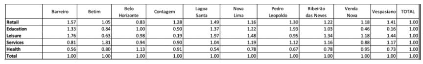 Seguindo essa análise, na seção seguinte propomos analisar a estrutura das centralidades por tipo de serviços na RMBH, uma vez que diferentes tipos de equipamentos podem seguir lógicas de distribuição divers no território metropolitano.