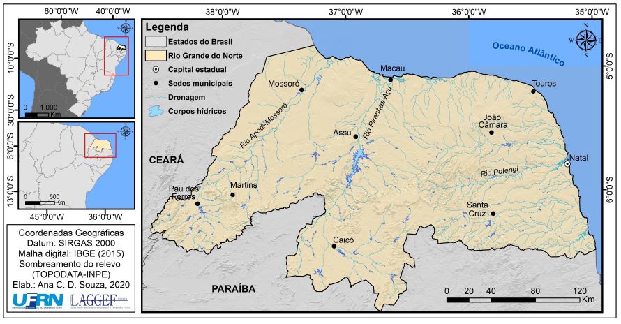 O estado do Rio Grande do Norte localiza-se no extremo nordeste do Brasil (Figura 1), aproximadamente entre as coordenadas 4°50'S e 6°59'S, e 34°58'W e 38°34'W; É um novo estado da região Nordeste e limitado ao oeste do estado do Ceará, seu estado da Paraíba e o norte e leste do Oceano Atlântico. Em 2020, a população estimada para o estado era de 3.534.165 habitantes (IBGE, 2020).