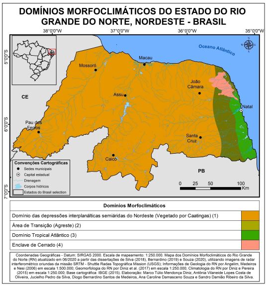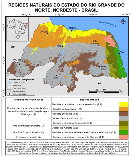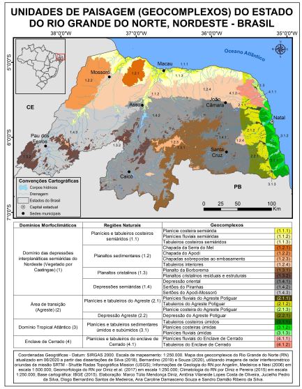 No trabalho original (DINIZ; OLIVEIRA, 2018), mapeou dois domínios morfoclimáticos, uma área de transição, regiões naturais e geocomplexos em uma escala de 1:250.000 para o estado do RN. Este artigo, recentemente embor, tornou-se base para estudos de larga escala, como o Projeto de Macrozona Ecológico-Econômica da Baía de Piranhas-Açu (COBRAPE, 2020), contratado pelo governo do estado do RN.