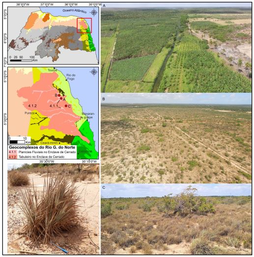 O cerrado é um domínio morfoclimático típico do Brasil Central, dominando especialmente os terrenos com apenas terras fortemente lixiviadas, especialmente os Latossolos, e não o Planalto Central, colocando assim seu escoamento no RN no caráter de enclave. Portanto, o Rio Grande do Norte possui dois domínios morfoclimáticos, uma área de transição e um enclave (Figura 2). Vale, por sua vez, ressaltar que essas duas últimas unidades não são domínios (AB'SABER, 2003), mas são rerepresentada no mapa de domínios por compatibilidade escalar.