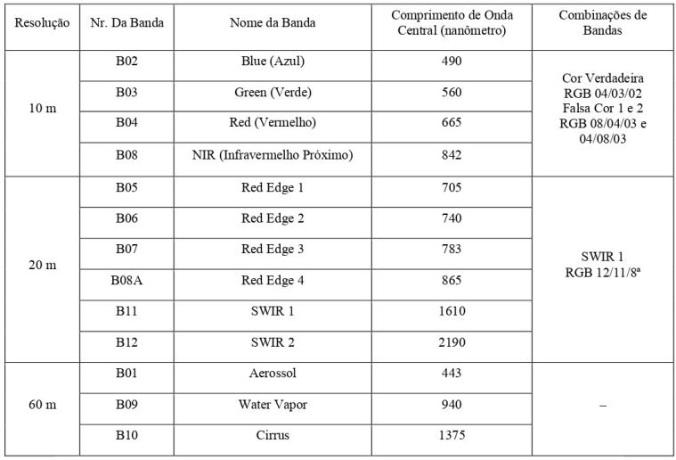 Para atualizar o mapeamento de área, dois satélites Sentinel-2A e 2B, órbitas 52 e 09, respectivamente, foram utilizados como Instrumento Multiespectral (MSI). O Serviço Geológico dos Estados Unidos (USGS) foi adquirido gratuitamente no site do Serviço Geológico dos Estados Unidos (USGS), pela https://earthexplorer.usgs.gov/. Este satélite possui 13 bandas espectrais que variam de 10 a 60 metros de resolução espacial (Tabela 1R4G3B2), todas com resolução de 10 metros. para a região do Leste e Litoral Agreste; e quatro imagens para o Seridó Potiguar, de 27/12/2018,
