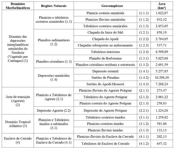Foi utilizado para compartimentalizar domínios morfoclimáticos no Brasil por Ab'Saber (2003), com foco no estado do RN; e os taxonômicos da região natural e dos geocomplexos de Diniz e Oliveira (2018),. Além disso, foram usados como análises concomitantes dos mapas geológicos do estado (ANGELIM; MEDEIROS; NESI, 2006) em uma escala de 1:500.000; Geomorfologia (DINIZ et al., 2017) em escala de 1:250.000; Solos do projeto RADAMBRASIL, chapa Jaguaribe Natal, na escala de 1:500.000 (BRASIL, 1981); e Climatologia em 1:500.000 (DINIZ; PEREIRA, 2015), que utilizou dados isoietas (SUDENE, 1990) para alterar os limites dos domínios morfoclimáticos da Mata Atlântica e Silvestre, considerando valores máximos de 1.200mm/ano.
